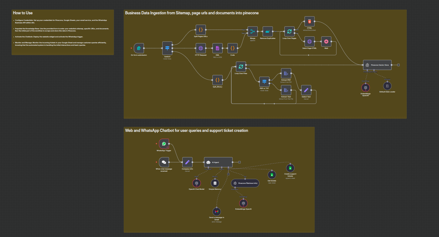 Tired of manually answering customer queries and managing support tickets? This n8n workflow automates the entire process, from data ingestion to a multi-channel chatbot and automated ticket creation. It's the perfect solution for businesses looking to build a powerful and intelligent chatbot, a comprehensive knowledge base, and streamline their customer support operations with a website widget support and a dedicated WhatsApp support agent.